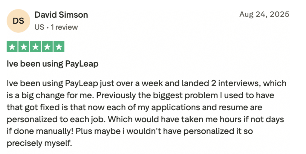 - Time-saving automation: Instead of rewriting resumes over and over, PayLeap adjusts them automatically to match each application.